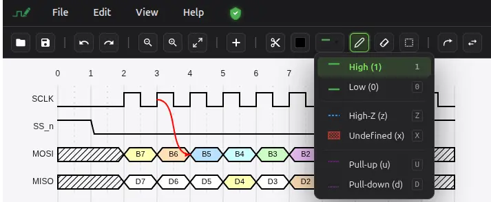 The main feature of WavePaint is its intuitive drawing system. Unlike WaveDrom where you write code, here you draw waveforms directly.