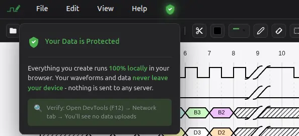 WavePaint runs 100% client-side in your browser. Your diagrams are never uploaded to any server. Save files locally on your computer in WavePaint’s native .wp format or export to standard formats.